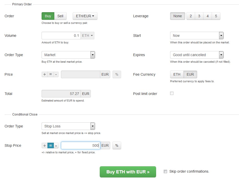 Pour illustrer, prenons un cas concret : vous souhaitez acheter 0,1 ETH au prix du marché, soit 572,70 €/ETH, l’équivalent de 57,27€ pour 0,1 ETH. Vous décidez de placer un stop loss à 500 €. Une fois que vous cliquez sur Acheter ETH avec EUR, Kraken exécute la transaction pour 0,1 ETH. Si le cours tombe à 500 €, la vente se déclenche automatiquement. Pour sécuriser davantage votre position, pensez à cliquer sur le bouton « – » à gauche du prix : cela garantit que l’ordre se déclenche dès que le prix passe en-dessous du seuil fixé.